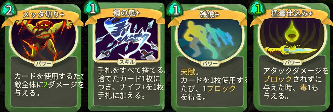 - 銀の嵐+ ー 手札をすべて捨てる。捨てたカード1枚につき、ナイフ+を1枚手札に加える。