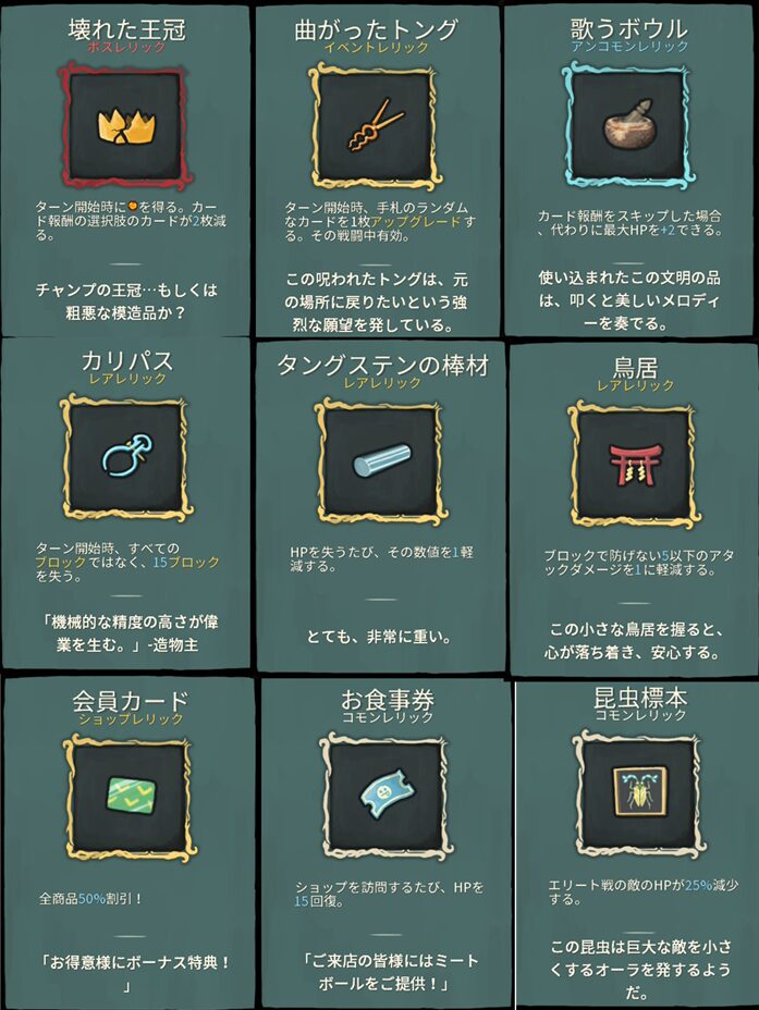 - 壊れた王冠 ー ターン開始時にエナジーを得る。カード報酬の選択肢のカードが2枚減る。